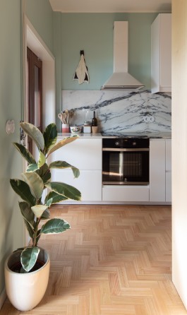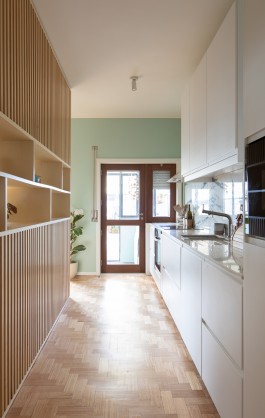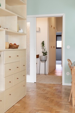 Therefore, our first gesture was to replace the kitchen/living room wall by a cabinet, controlling the permeability between the spaces and maximizing and unifying the distribution of natural light.