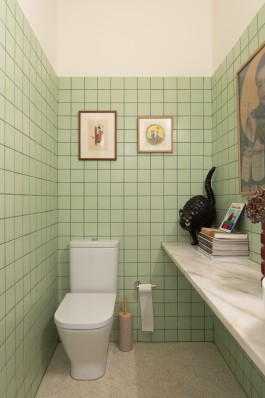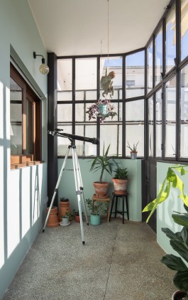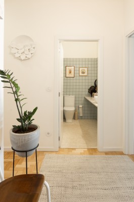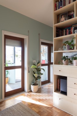 The selection of materials and languages adopted in this project converged on one main goal: to harmonize the apartment in the building in which it is inserted. In that sense, we used insulated wooden windows, terrazzo and hand painted tiles for the toilets, wooden parquet for the floors, marble for the kitchen, cast iron and terrazzo for the patio, detailed and lacquered woodwork for doors and wardrobes, and hammered glass in the hall door. This materials palette, together with the design of some furniture, has provided a sense of detail which connects the apartment with its past identity. Nevertheless, the quality and the truth of the materials ensures its future.