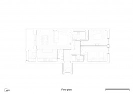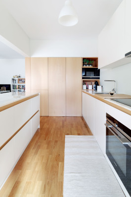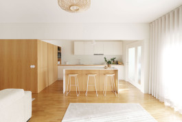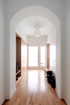 Our strategy was to demolish the wall between the kitchen and the living room, to redesign the distribution hall in order to introduce a second bathroom, to design a new kitchen and to repair the existent wood floor.